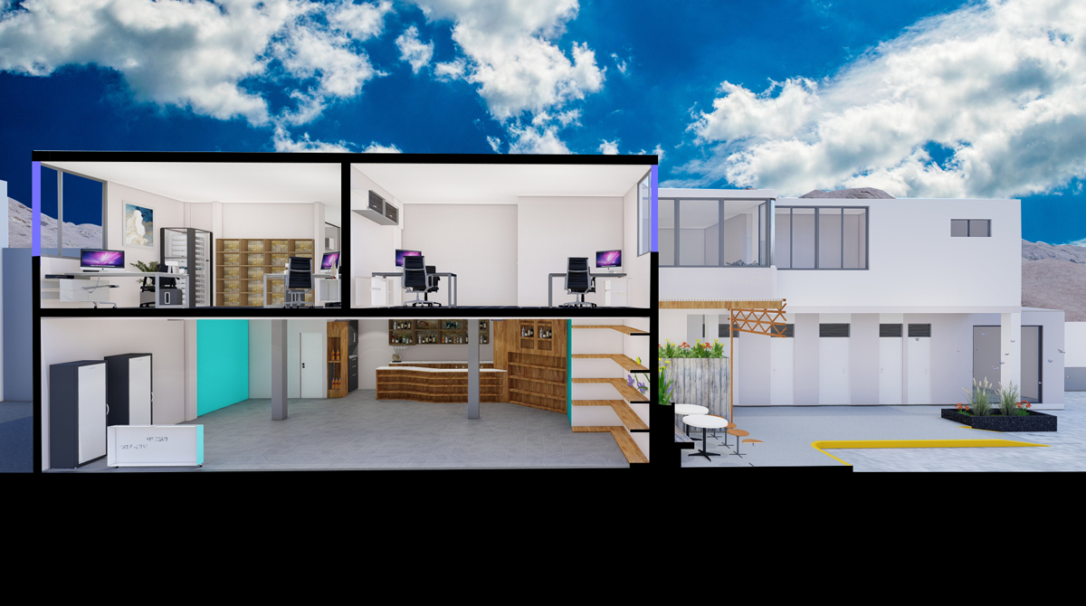 De igual manera, en el segundo nivel contamos con un área de 159.60 m2, donde se ubican los ambientes de uso administrativo. La oficina de gerencia general, un ambiente cerrado de oficinas para dos escritorios, un ambiente abierto para dos escritorios, una sala de reuniones, una sala de espera con su baño incluido y tres ambientes para servicios higiénicos para el personal cada una con sus duchas incluidas.